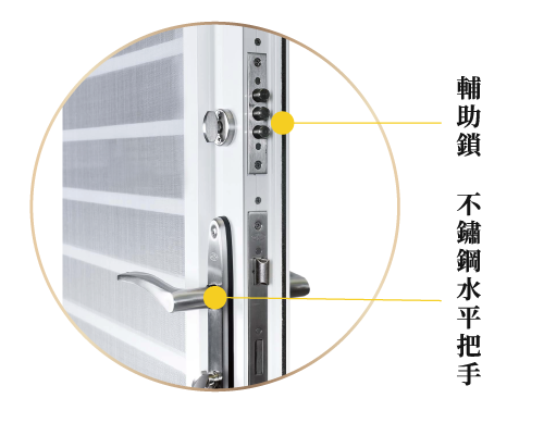 時尚典雅不鏽鋼水平把手,低調奢華,使用更耐久。並搭配輔助鎖,讓居家安全多一份保障。